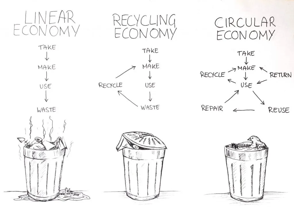 This fantastic diagram, to explain the difference between Linear, Recycling and Circular Economies has been drawn by my beautiful friend and extremley talented Lucy Gallard.