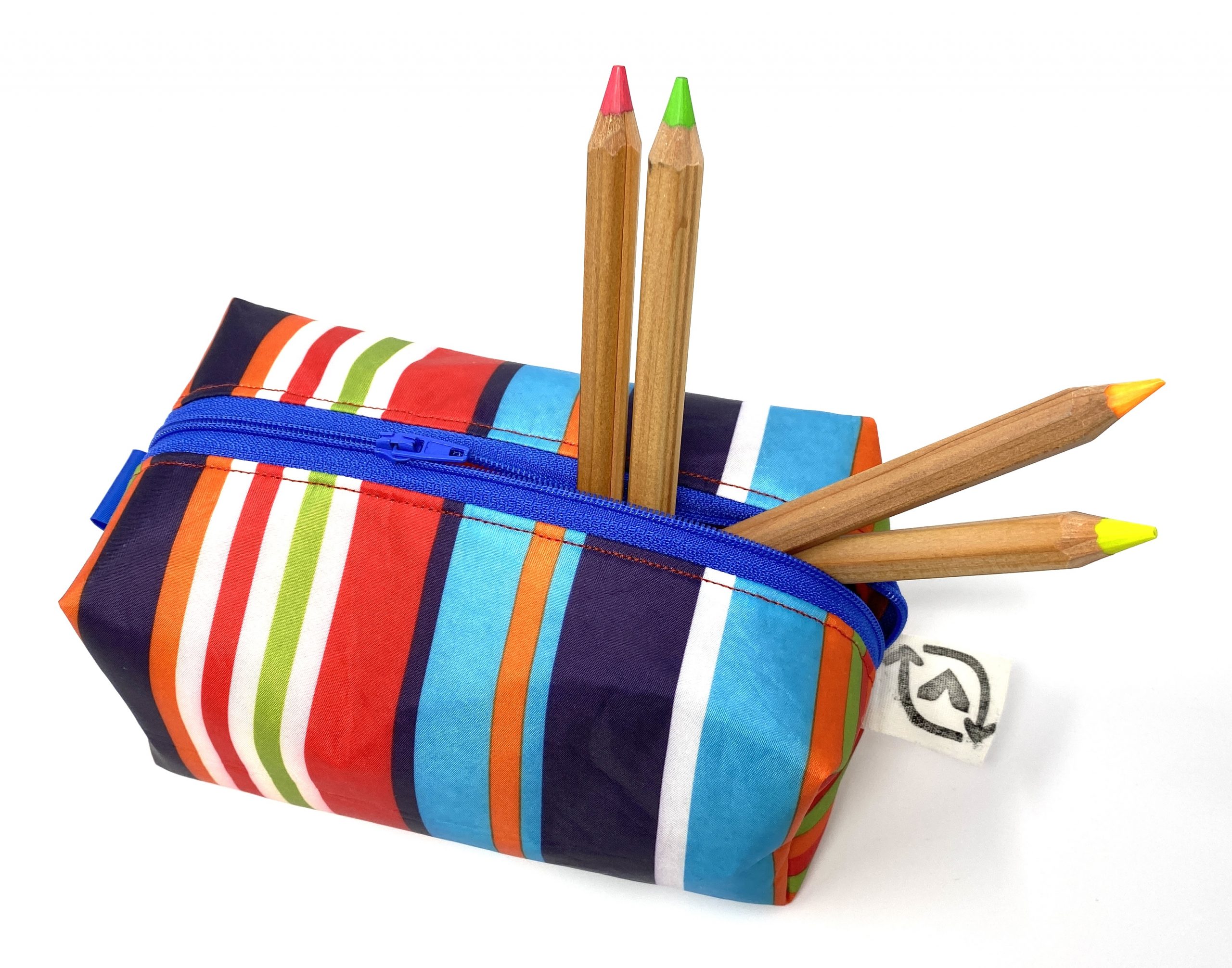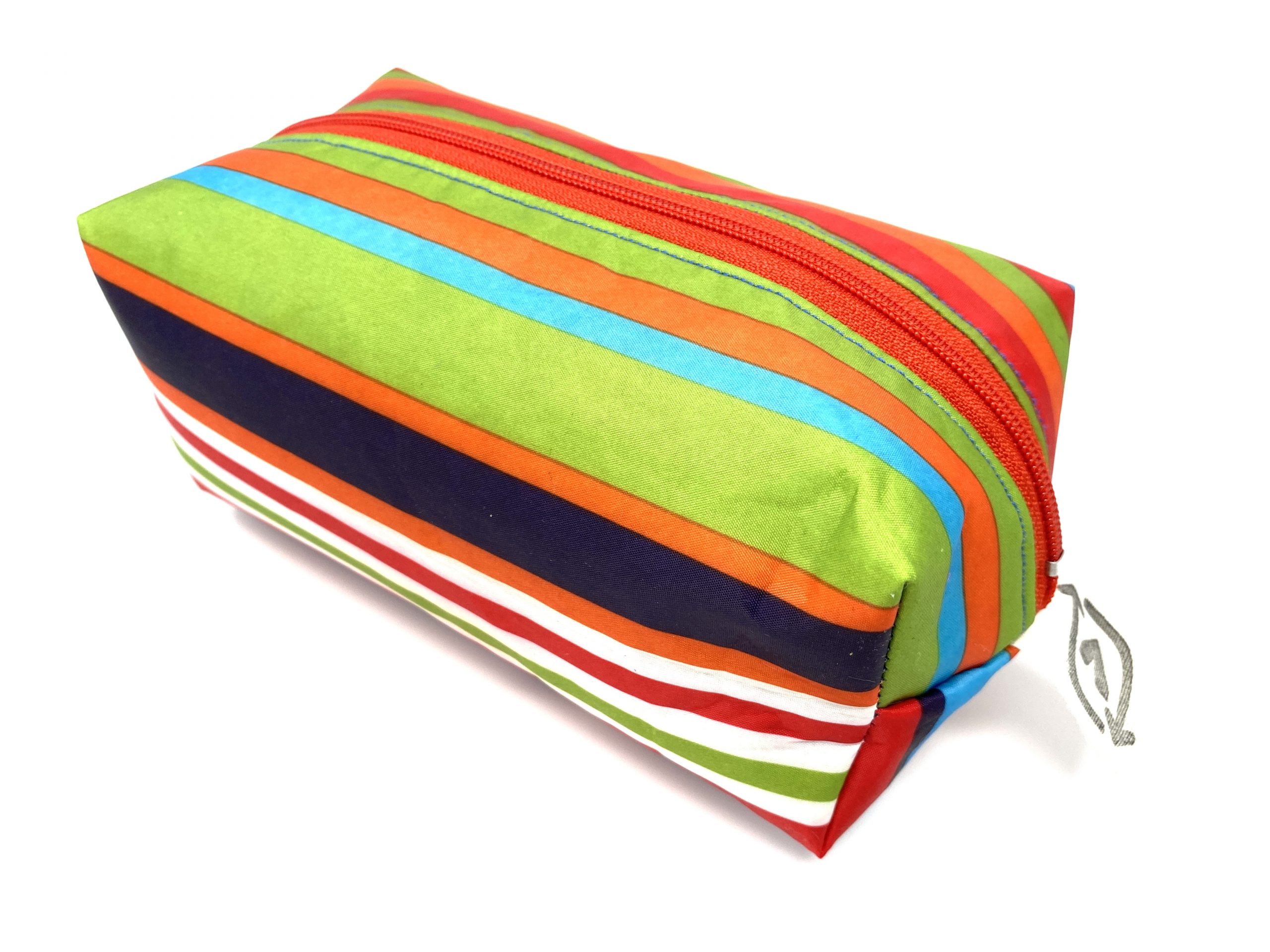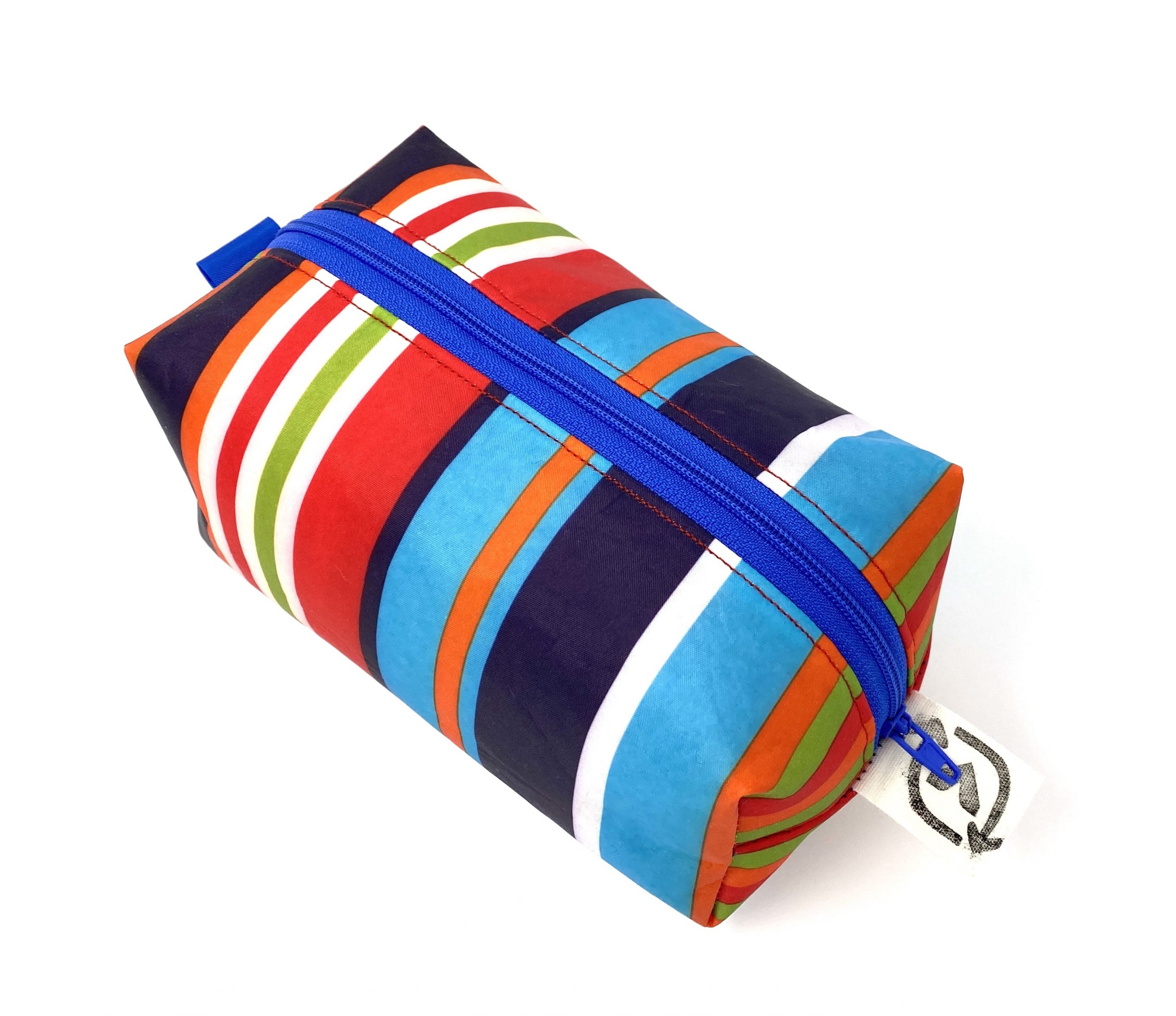 I have used a selection of tent fabrics salvaged from camp-sites to create these. Each bag is reinforced with a small amount of interfacing to help it keep its shape. Lined with more tent fabric, and sealed with a complimentary zipper.