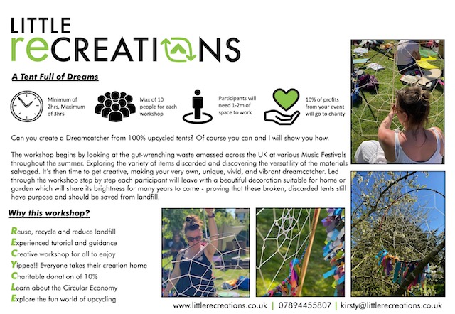 Creating a dreamcatcher from 100% upcycled pop-up tents. Begin by looking into the gut-wrenching waste across the UK at various music festivals throughout the summer, guests are invited to create a vivid, and vibrant dreamcatcher proving that these discarded items still have life and can be saved from landfill. Led through the workshop step by step each participant will leave with a beautiful decoration suitable for home or garden which will share its brightness for many years to come.