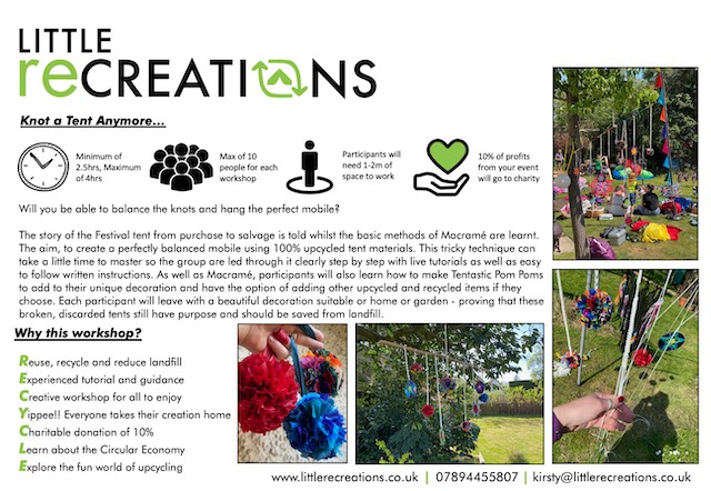 Time to put your knotting skills to the test, learning the basic techniques of Macrame. Creating a perfectly balanced mobile using 100% upcycled tent materials. The story of the festival tent from purchase to salvage is told while guests begin to knot together their mobile. This tricky technique can take some a little time to master so the group are led through it clearly step by step with live tutorial as well as easy to follow written instruction. As well as Macrame, guests will learn how to make Tentastic Pom Poms to add to their creations and have the option of adding in other upcycled and recycled items if they choose. Each participant will leave with a beautiful decoration suitable or home or garden. This workshop is suited to 1/2 day or even a full day, dependant on skill and ability, packs will be provided for guests to finish their creations at home if they do not complete them within the workshop.